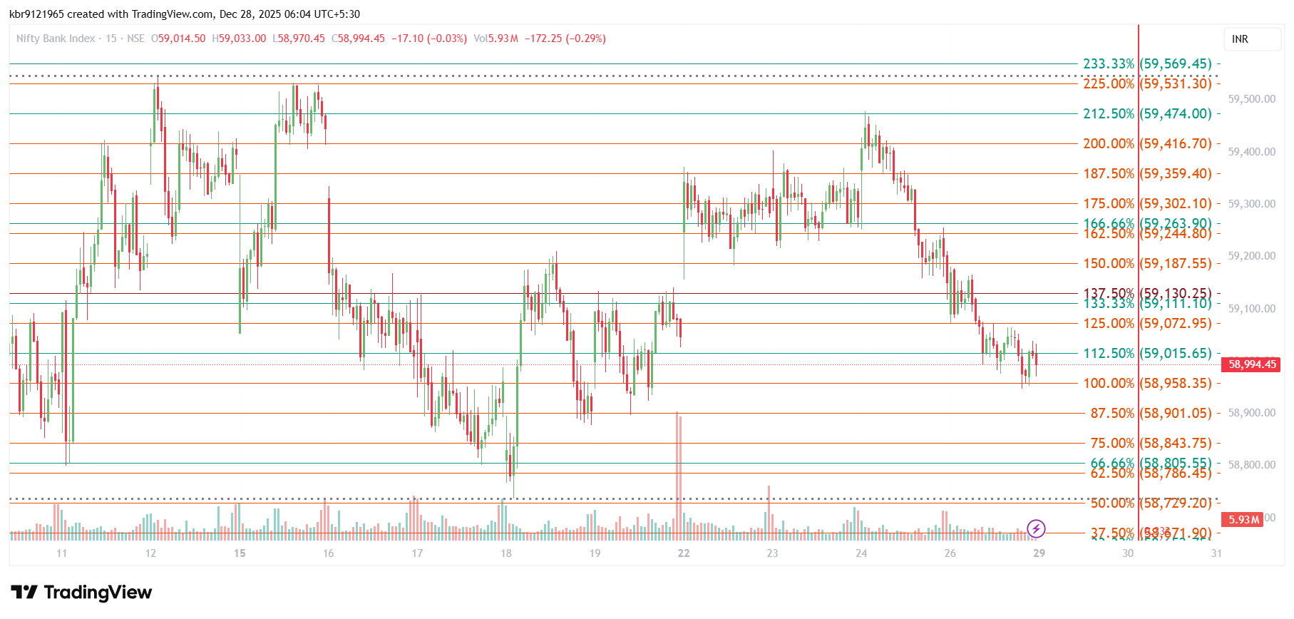 Bank Nifty has made an ATH at 60114.30 on 01 December 2025. Bank Nifty has dropped to make a swing low at 58712.20 on 18 December 2025. Next swing high was 59478.15 on 24 December 2025. Gann swing range for the current week is from 58958 to 59417. Gann lower swing range could take it to 58500 on lower side. Gann higher swing range could take it to 59875 on higher side.