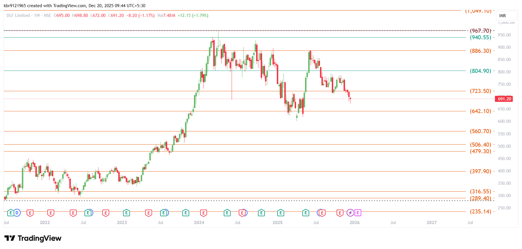 DLF share Gann Price Cycle Chart is updated with important Gann levels shown on it. Each level will act as resistance and support as and when price action is formed around it. The ATH on the share is 1225 and ATL is 72.35. We have hit high of 967 in April 2024. The corrective price is seen post that high. DLF needs to sustain above the level of 886 which is vertical angle level in Gann.  The Gann level of 630 needs to be watched critically for this stock from where meaningful bounce can occur if the corrective price action continue its downward move.  For recovery the stock needs to sustain above 724 level. The stock can be looked at 630 levels if it provides an opportunity with suitable risk reward ration as per the individual risk capacity.