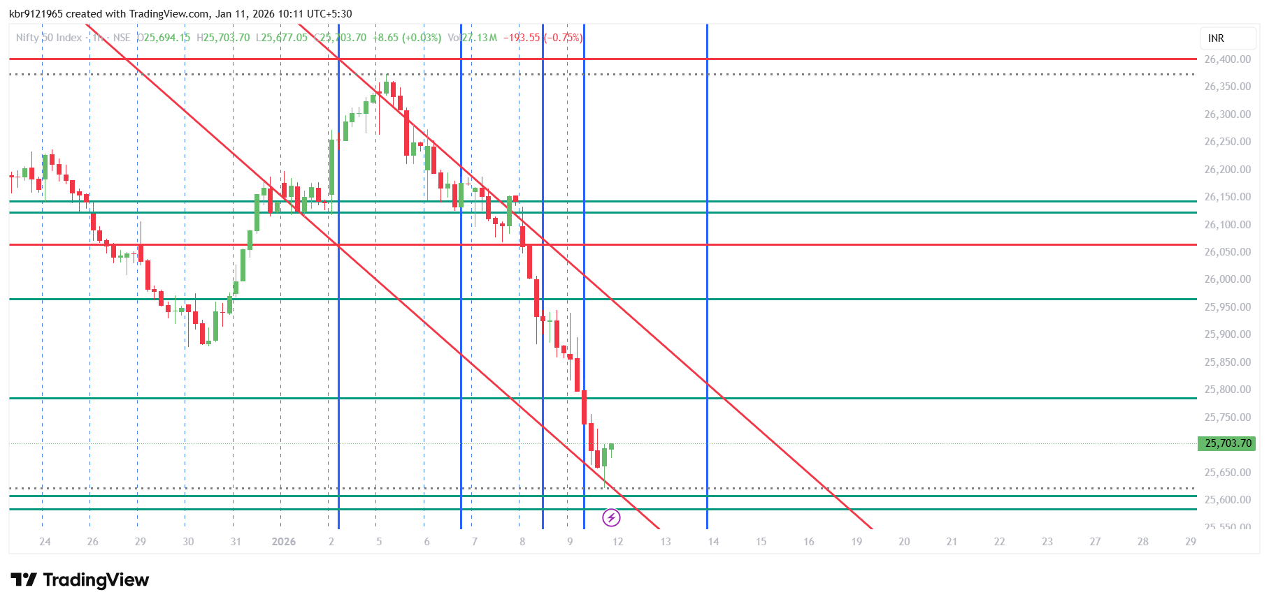 Nifty 50 update for the week starting 12 Jan 2026. Nifty 50 index correction from the 01 Dec 2025 high continues. The fall has escalated from the side ways range. Major support on Nifty 50 Index is 25700 Gann fixed level. We breached it intraday and closed the week for the close at 26683.30 as the average(last half hour average close)  close for the week. Close on charts seen on Trading View is 26703.70 which was final tick close.