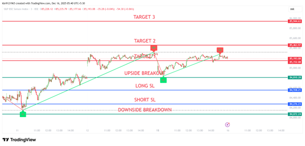Sensex closed on the Gann Swing chart at 85213.36 on 15 Dec 2025. The breakout levels for swing chart on either side are 84810.28 and 84072.24. The upside Gann Swing targets are 85152.08/85463.97 and 85944.63. The downside Gann Swing targets are 83682.35/83370.46 and 82889.80.